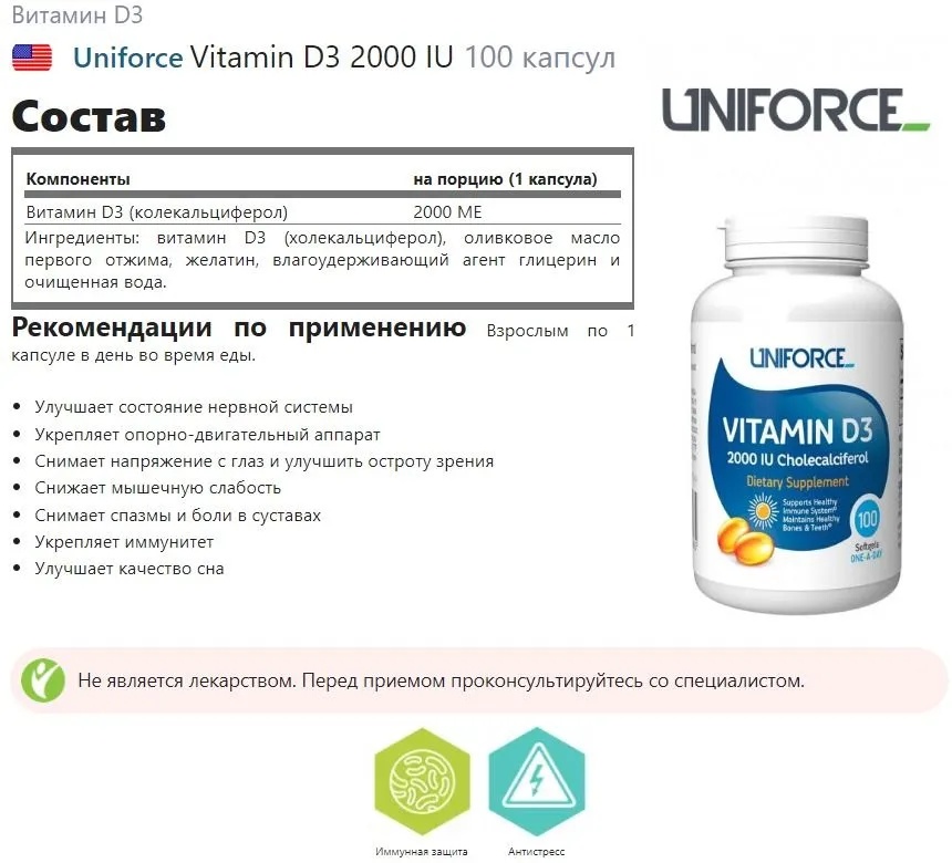 UNIFORCE Vitamin D3 2000 МЕ 100 капс