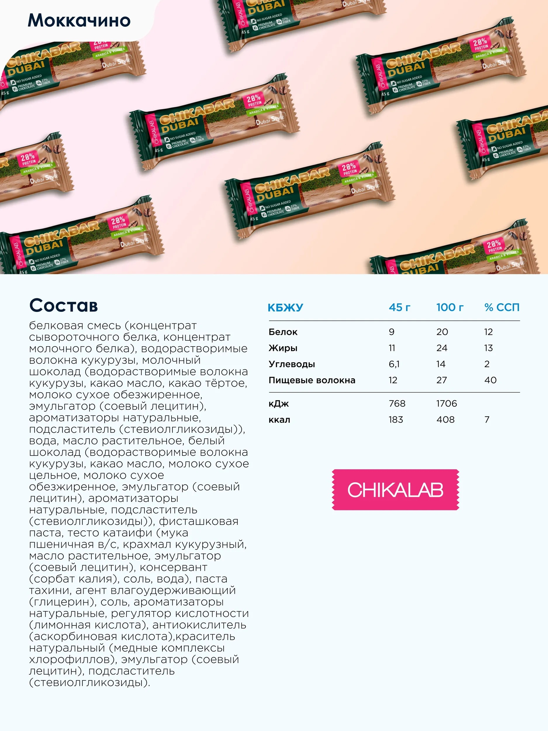 CHIKALAB Батончик глазированный Моккачино с фисташкой и хрустящим тестом 45 г