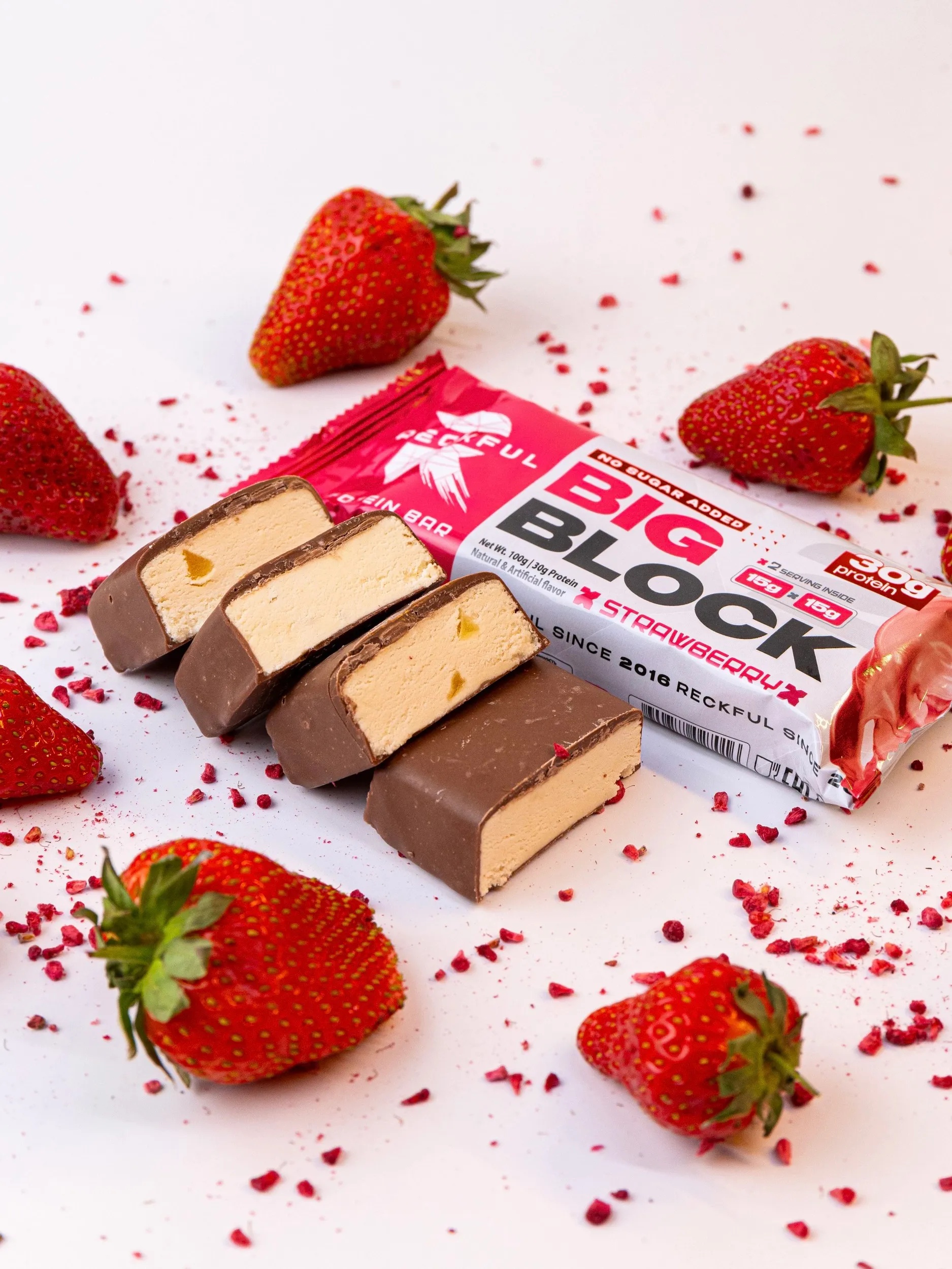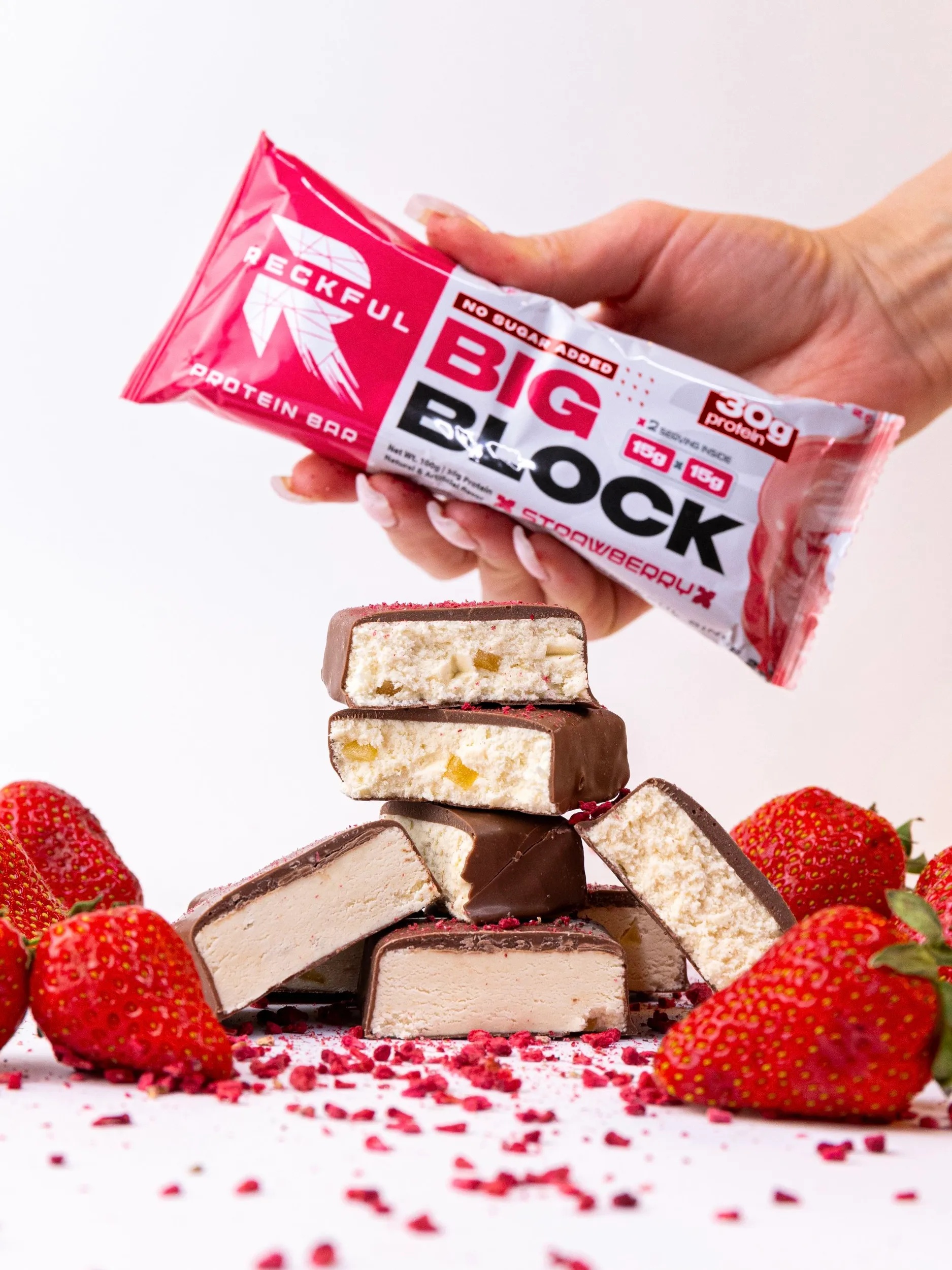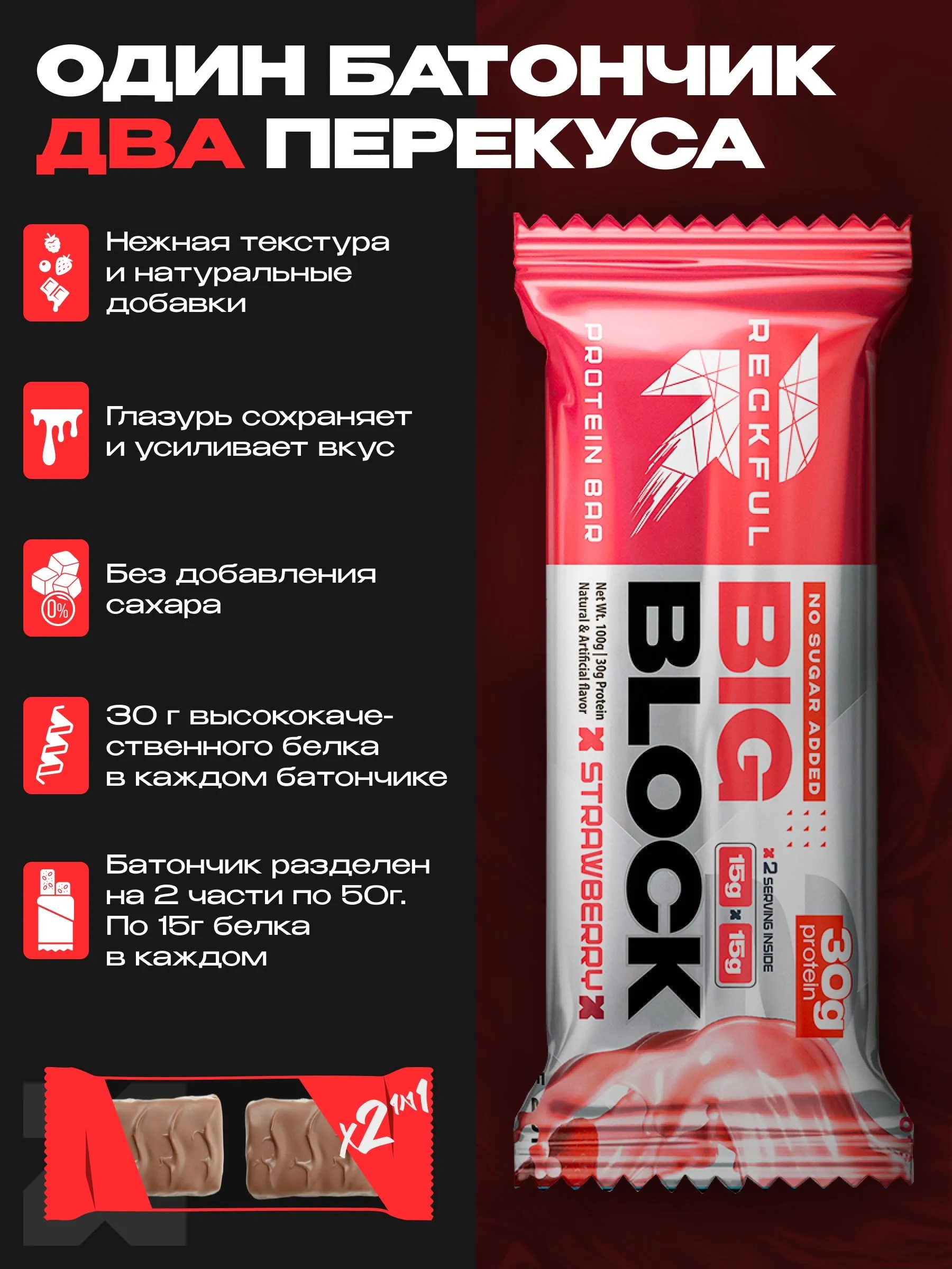 RECKFUL ® PROTEIN BAR - BIG BLOCK 100g 1 батончик 30г белка (Клубника со сливками в молочной глазури)